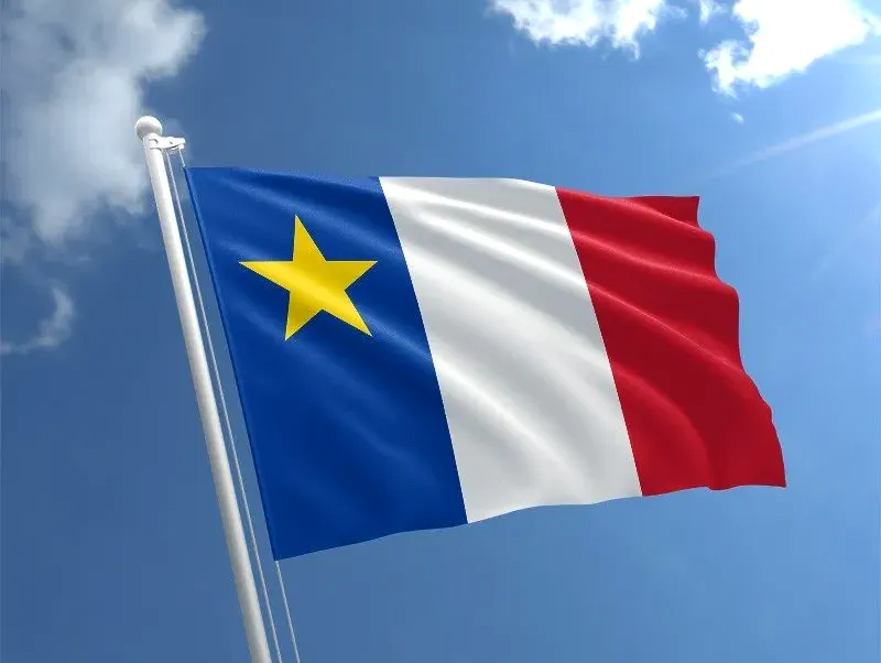 Acadian Flag 1884. Red, white and blue like the flag of France. The gold star at the top left, the Stella Maris (Star of the Sea),